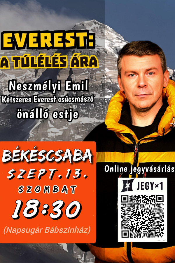 Everest: A túlélés ára Neszmélyi Emil önálló estje (Békéscsaba) szept 13 Featured 18:30 - 19:30 Everest: A túlélés ára Neszmélyi Emil önálló estje (Békéscsaba)